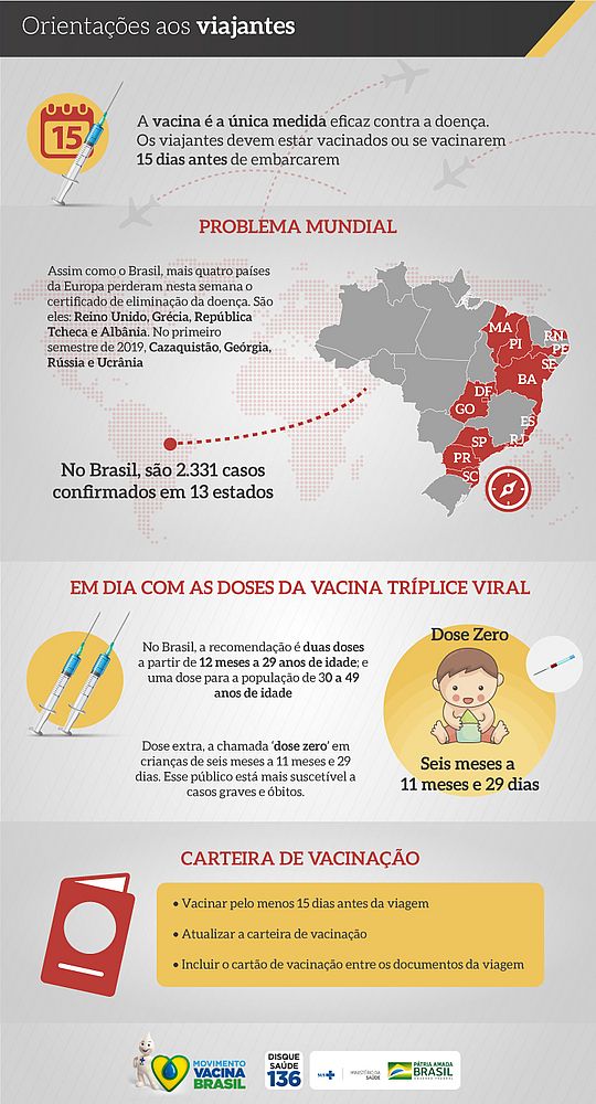 Diante desses cenários, as pessoas que vão viajar, tanto para destinos nacionais quanto internacionais, devem se certificar que estão em dia com as doses da vacina tríplice viral, que protege contra sarampo, rubéola e caxumba, conforme previsto no Calendário Nacional de Vacinação, do Sistema Único de Saúde (SUS). No Brasil, a recomendação é duas doses a partir de 12 meses a 29 anos de idade; e uma dose para a população de 30 a 49 anos de idade. Os pais também precisam ficar atentos. Atualmente há ainda a recomendação do Ministério da Saúde de aplicar uma dose extra, a chamada ‘dose zero’ em crianças de seis meses a 11 meses e 29 dias. Esse público está mais suscetível a casos graves e óbitos.