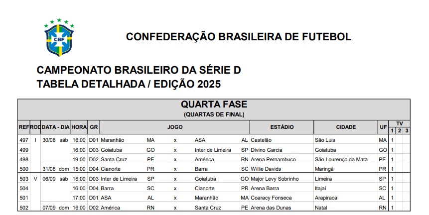 A Confederação Brasileira de Futebol confirmou, nesta terça-feira, 26, as datas, os horários e os locais dos confrontos entre ASA e Maranhão, na quarta fase da Série D do Campeonato Brasileiro 2025. Quem se classificar, carimba o acesso à Série C da próxima temporada.