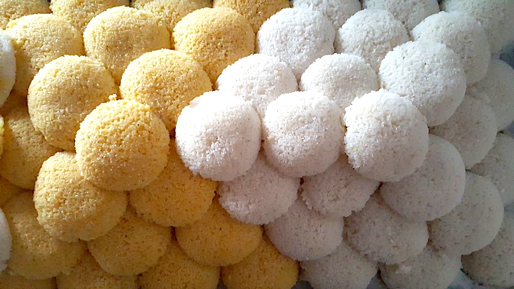 A alagoana compra o arroz na feira, coloca de molho, lava mais de uma vez, seca ao sol e passa o grão no moedor mais de uma vez até virar pó. Com a farinha pronta, ela leva para a panela com três mini cuscuzeiras que mandou um soldador improvisar. Deita uma fita de tecido nas cuscuzeiras e por cima a farinha misturada com o bagaço do coco, e dá lá saem suaves cuscuz de arroz cobertos pelo leite de coco natural, é uma benção. Telefone: 82 99637-8626