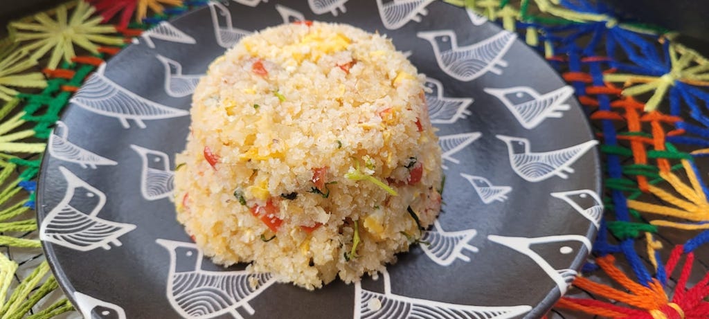 Farofa de Cuscuz de Arroz, basta refogar tomate, cebola e coentro na manteiga.