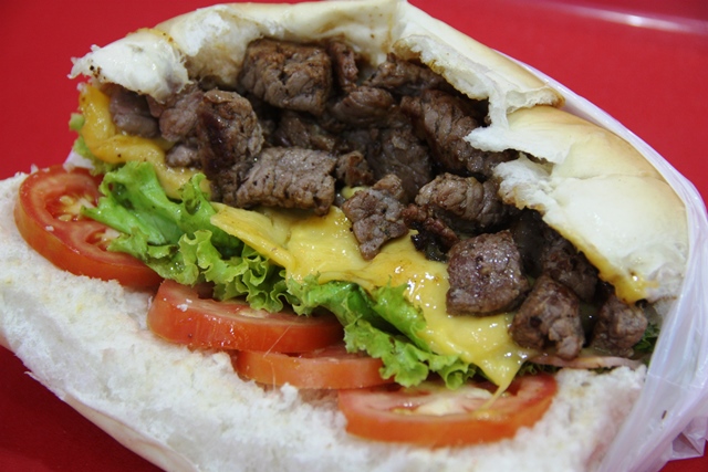 O hambúrguer é uma receita tradicional, bem temperado e bem assado com direito a uma crostinha. Ele é redondo, mas para caber no pão seda é cortado e, claro, vem arrochado com maionese, um patrimônio do Passaporte Gaúcho.