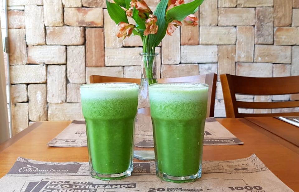 Manga Verde: Suco Detox, uma mistura do sumo da couve, pepino, gengibre e hortelã