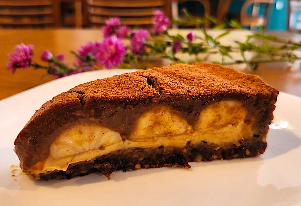 Agora no sistema de delivery, apenas o banoffe do Manga Verde é preciso encomendar, Na receita é zero de açúcar, de lactose e de glúten. É mais que perfeito, o biscoito (base da sobremesa) é substituído pelas oleaginosas (mix de castanha), dando crocância perfeita. Em vez do doce de leite, entra em cena mousse de maracujá, banana bem madura e, por fim, creme de ameixa para brindar a doçura polvilhada com cacau 70%