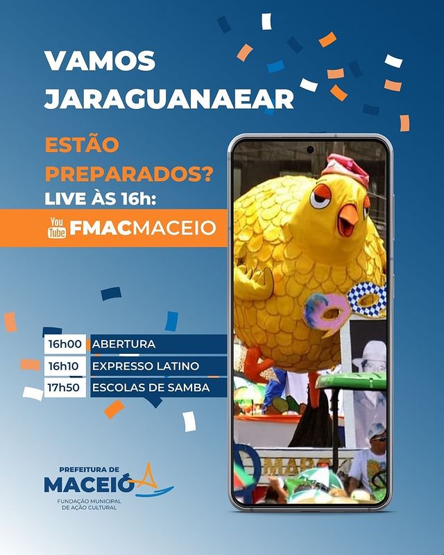 A live, que começa às 16h com transmissão pelo canal da FMAC no YouTube, também vai contar com as apresentações das escolas de samba que fazem parte da Liga das Escolas de Samba Independente de Maceió (LEIM), levando passistas, estandartes e mascotes para colorir o bairro mais histórico da capital.