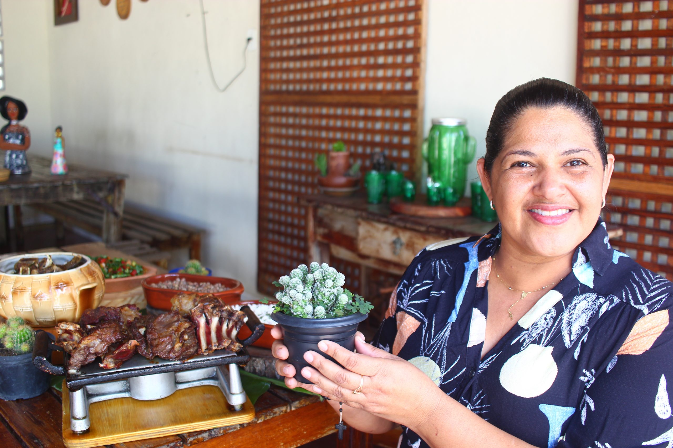 Já tradição do bode seco, Edna aprendeu a mãe Fátima Almeida, dona de uma churrascaria no povoado Jardim Cordeira, em Delmiro Gouveia. “Desde menina eu gostava de acompanhar minha mãe no restaurante, uma brincadeira que despertou minha paixão pela culinária, como ajudar a retalhar a carne, cobrir de sal e deixar no varal até três dias para virar carne do sol”, conta. Há 20 anos, ela abriu seu restaurante Tatuakara com as tradições do bode seco e carneiro guisado com feijão verde na manteiga de garrafa e farofa d’água.