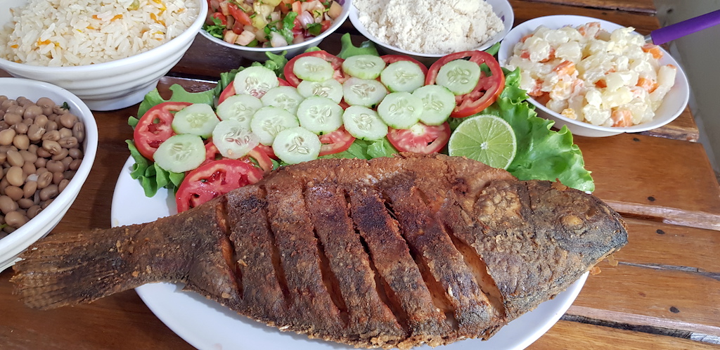 Tatuakara: Peixe tilápia com arroz, feijão, salada, maionese e farofa
