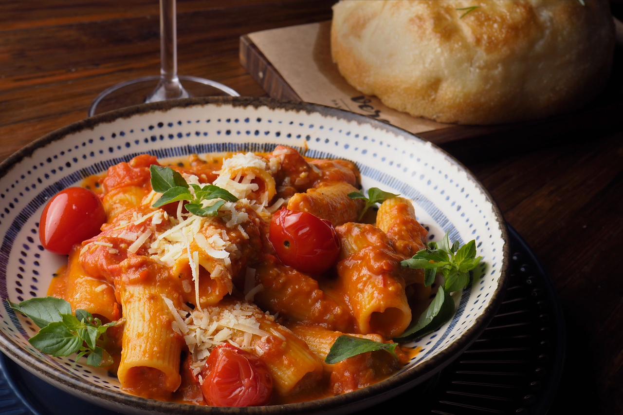 Vero: Rigatonni no molho feito de doces tomates cerejas, tomate San Marzano, temperado queijos italianos Pecorino Romano e Parmigiano Reggiano