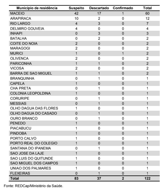 "No que se refere aos casos positivos: ambos são do sexo masculino, tendo como municípios de residência Maceió e Murici, com idade de 35 e 25 anos, respectivamente", continua.