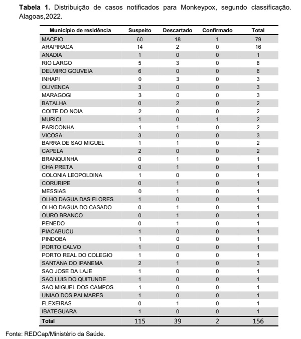 O boletim também mostrou que antes eram 30 municípios alagoanos que tinham contabilizado ao menos um caso suspeito de Monkeypox. A Sesau, no último informe, porém, publicou que o número pulou para 35, ou seja, um aumento de 16,6%.