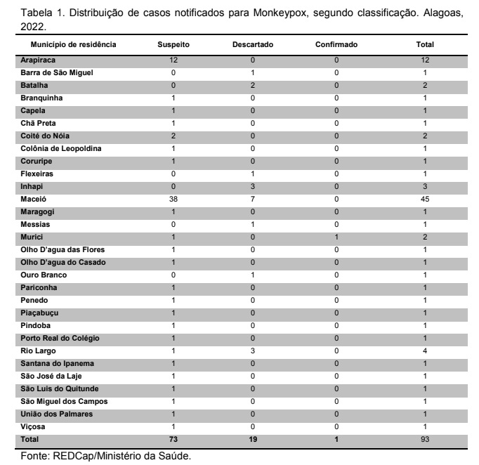 "Até o dia 22/08, foram notificados 93 casos como suspeitos de Monkeypox, destes, 01 (1,1%) caso foi confirmado, 19 (20,4%) foram descartados e 73 (78,5%) encontram-se em investigação. Além disso, verifica-se que o município de Maceió com é o que possui o maior quantitativo de casos (45 - 48,3%), seguido de Arapiraca (12 - 13%) e Rio Largo (4 - 4,9%)", informou a Sesau no boletim divulgado no final desta tarde.