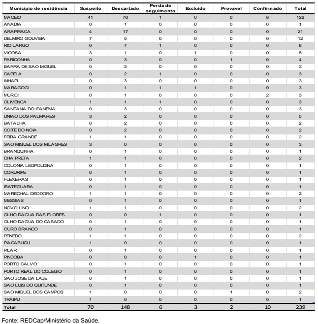 Até agora, a Sesau notificou 239 casos suspeitos de monkeypox. Além, dos dez confirmados, foram identificados 2 casos prováveis, 6 casos com perda de seguimento e 148 casos foram descartados. De acordo com a Sesau, 70 casos encontram-se em investigação. Além disso, verifica-se que o município de Maceió é o que possui o maior quantitativo de casos (126; 52,7%) seguido de Arapiraca (21; 8,8%) e Delmiro Gouveia com (12; 5%). Foram excluídos 3 casos por não atenderem definição proposta pelo Ministério da Saúde dos seguintes municípios: Pindoba, Maragogi e Viçosa. Veja o boletim completo.