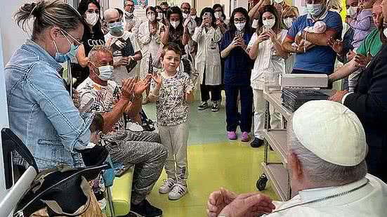 Nas imagens, o papa aparece em uma cadeira de rodas e cercado de pacientes e da equipe médica. Francisco conversou com algumas pessoas e recebeu cartas, desenhos e mensagens durante a visita.