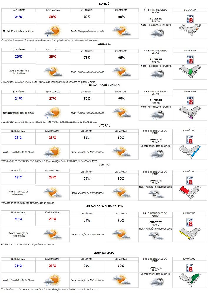 Na capital Maceió, no Litoral, na Zona da Mata e no Baixo São Francisco, a meteorologia prevê possibilidade de chuva fraca pela manhã e à noite, como também variação de nebulosidade no período da tarde.
