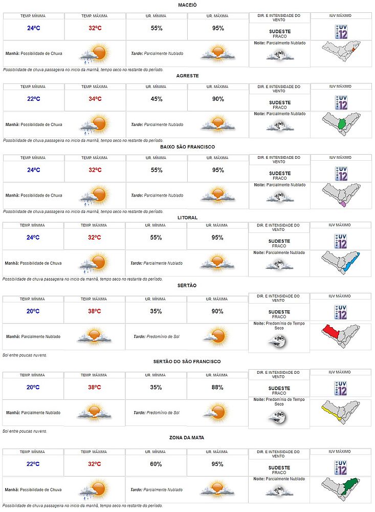 Assim como a capital, as regiões do Litoral, da Zona da Mata, do Baixo São Francisco e do Agreste devem apresentar o tempo instável ao longo desta quinta. A meteorologia também prevê chuva durante a manhã nessas regiões e tempo nublado a partir da tarde.