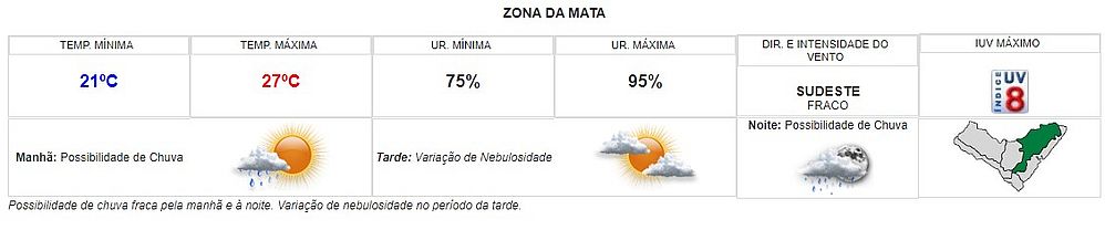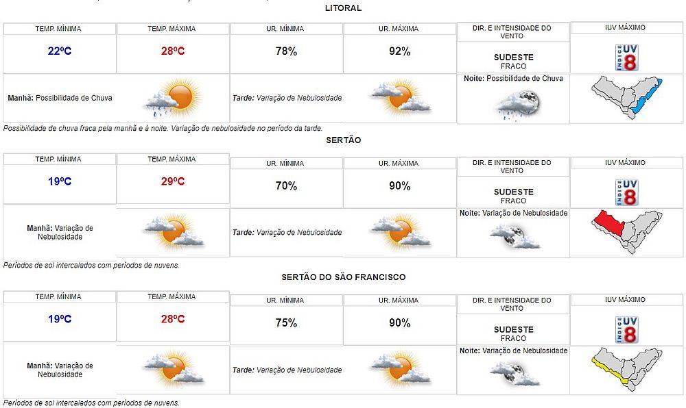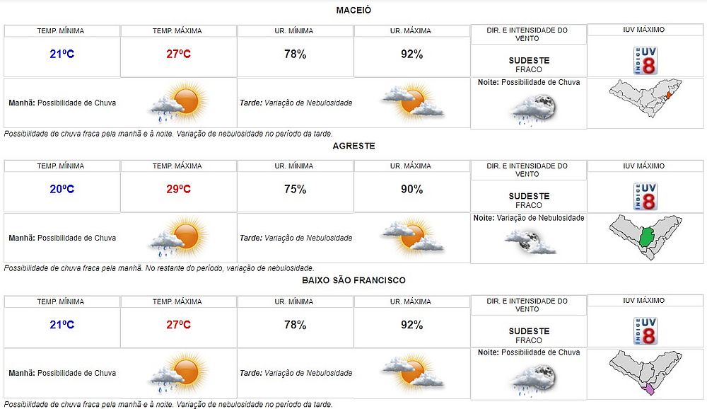 A previsão do tempo para esta terça-feira, 11, em Alagoas é de possibilidade de chuva de menor intensidade em quase todas as regiões do Estado, de acordo com a Secretaria de Estado de Meio Ambiente e Recursos Hídricos de Alagoas (Semarh-AL). Em Maceió, no Litoral, Agreste, Sertão do São Francisco e Zona da Mata, a previsão é de que a chuva seja fraca pela manhã e à noite. A temperatura mínima é de 19º no Sertão e a máxima é de 29º no Agreste e no Sertão. Veja abaixo a previsão completa.