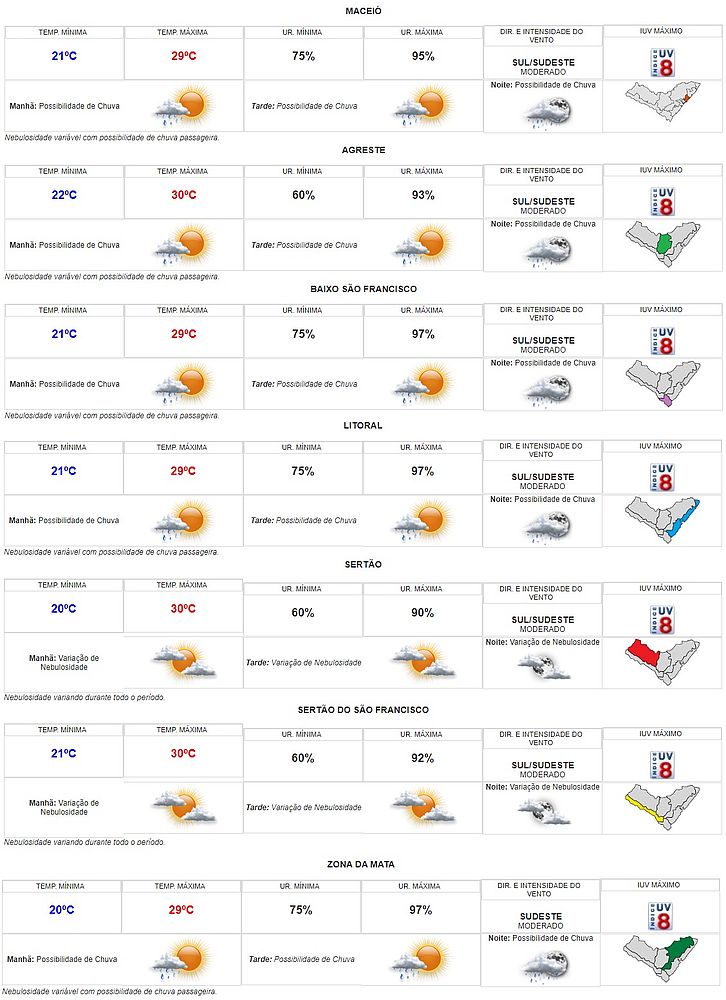 A Secretaria de Estado de Meio Ambiente e Recursos Hídricos de Alagoas (Semarh-AL) divulgou a previsão do tempo para esta terça-feira, 4, em todas as regiões alagoanas.