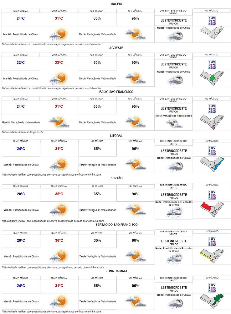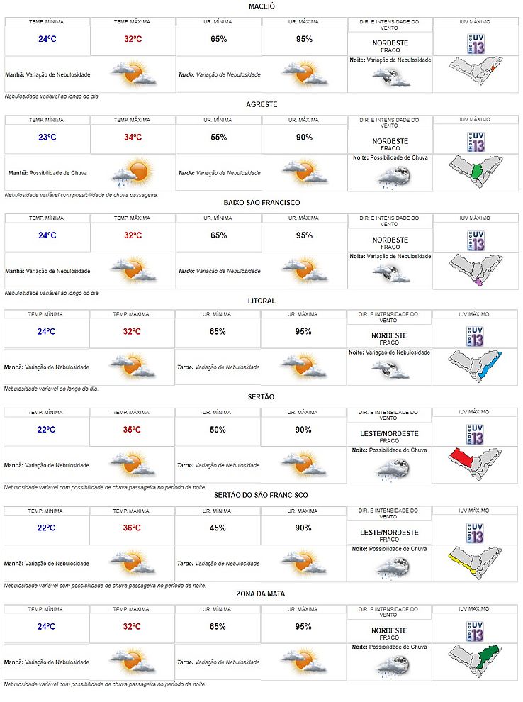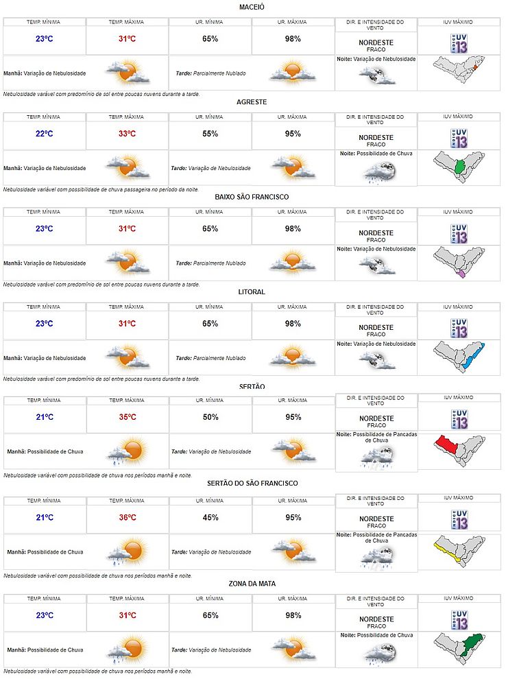 A previsão do tempo para este primeiro fim de semana de março em Alagoas é de variação de nebulosidade em praticamente todas as regiões do estado. Segundo a Secretaria de Estado do Meio Ambiente e Recursos Hídricos (Semarh), a menor e a maior temperatura podem ser registradas no Sertão do São Francisco, que tem mínima de 20ºC e máxima 36ºC na previsão.
