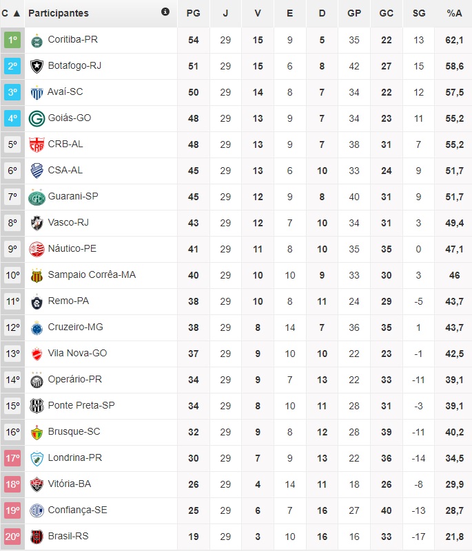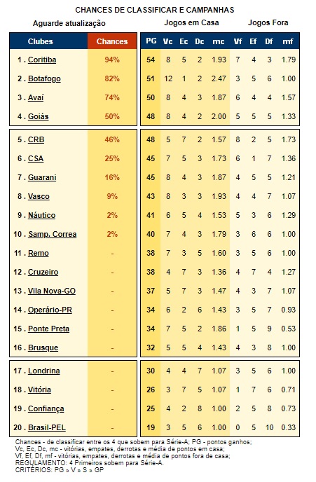Mesmo com a derrota para o Cruzeiro, o líder Coritiba ainda tem margem de distância para o quinto colocado e possui 94% de chances com 54 pontos. Logo atrás, o Botafogo venceu o confronto direto com o CRB, chegou aos 51 pontos e encostou no Coxa, tendo 82% de chances. Terceiro colocado com 50 pontos, o Avaí empatou em casa com a Ponte Preta e aparece com 74%. O Goiás, quarto colocado com 48 pontos, foi derrotado pelo Náutico no Recife e está com 50%.