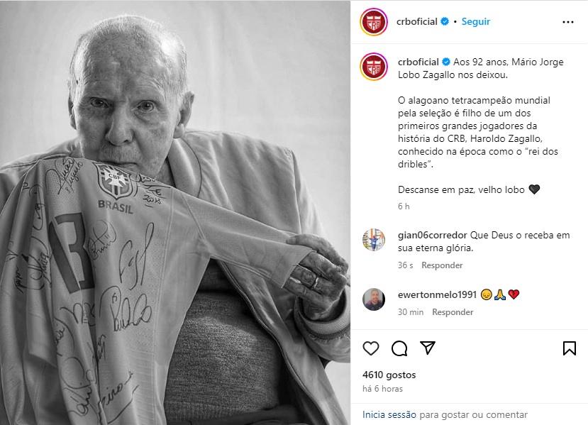 Além de lamentar a morte, o CRB ainda relembrou que o pai do camisa 13, Haroldo Zagallo, foi um dos primeiros grandes jogadores da história do clube.