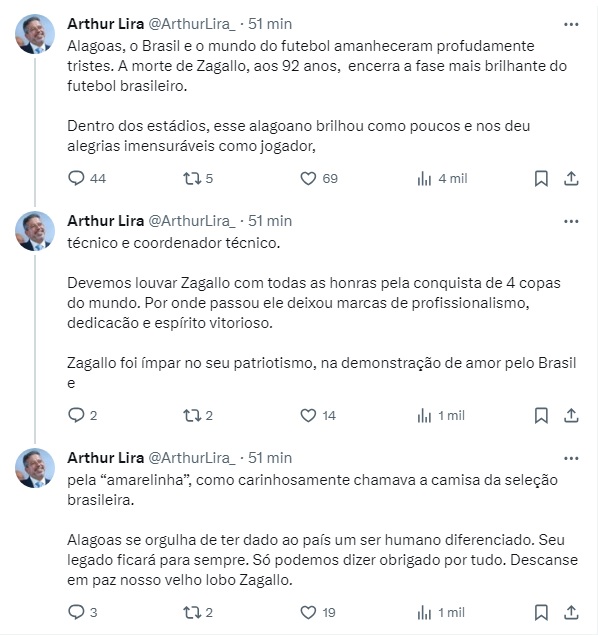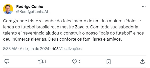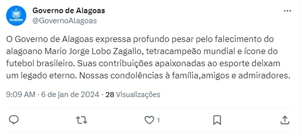 O perfil oficial do Governo de Alagoas também publicou uma mensagem exaltando o alagoano e lamentando o falecimento.