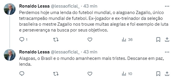 Ronaldo Lessa (PDT), vice-governador de Alagoas, ressaltou as alegrias trazidas por Zagallo e o citou como um "exemplo de luta e perseverança".