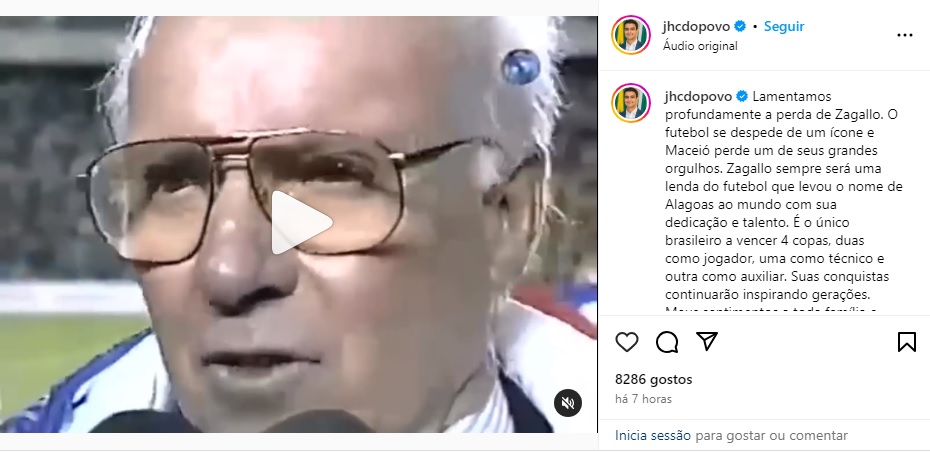 Prefeito de Maceió, cidade onde Zagallo nasceu, JHC (PL) prestou sua homenagem relembrando a memorável entrevista após a vitória sobre a Bolívia na Copa América de 1997, na qual cunhou a famosa frase: “vocês vão ter que me engolir”.