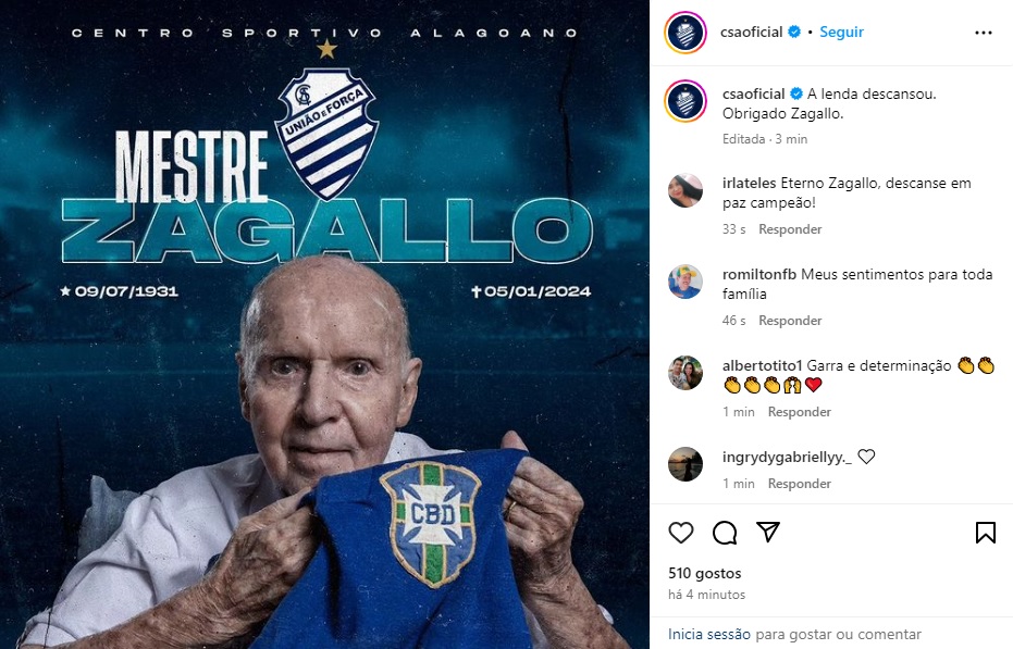 O CSA agradeceu ao Zagallo pelos feitos no futebol. "A lenda descansou".