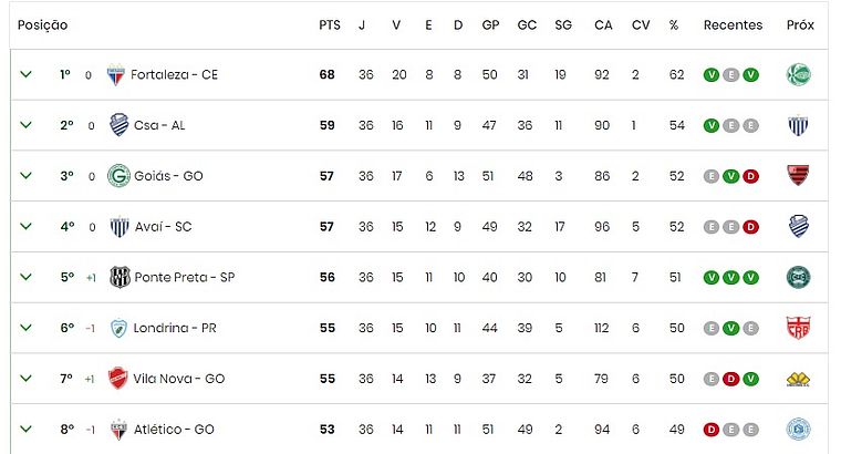 Com 59 pontos, o CSA aparecem na vice-liderança da Série B, seguido por Goiás (3º, com 57 pontos e 70% de chances) e Avaí (4º, com 57 pontos e 56% de chances). Fora do G-4, a Ponte Preta chegou de vez na luta por uma vaga e está na quinta posição, com 56 pontos e 44% de chances. O Londrina é o sexto colocado, com 55 pontos e 25% de chances. Os outros dois times que ainda podem subir são Vila Nova (7º, com 55 pontos e 13% de chances) e Atlético-GO (8º, com 53 pontos e 2% de chances).