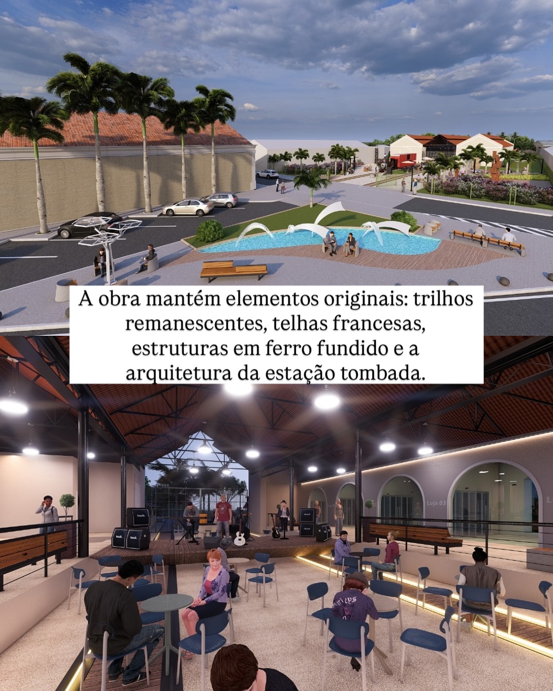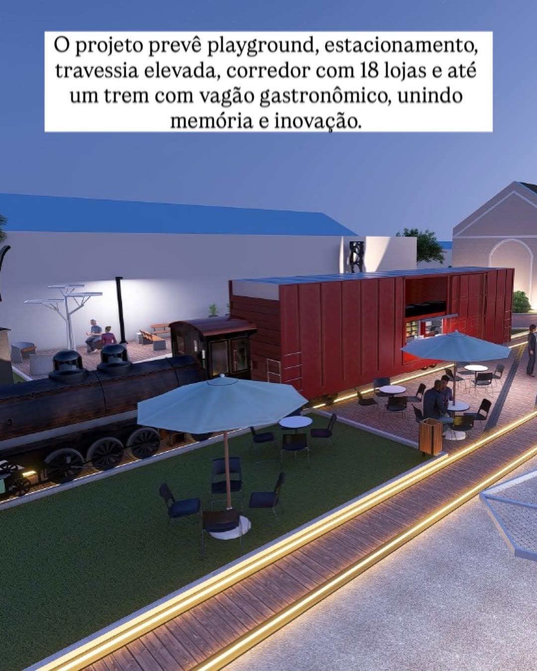A proposta inclui áreas de convivência, playground, estacionamento, travessia elevada para pedestres e um corredor comercial com 18 lojas, além da chegada de um trem com vagão adaptado para gastronomia, unindo memória ferroviária e novos usos.
