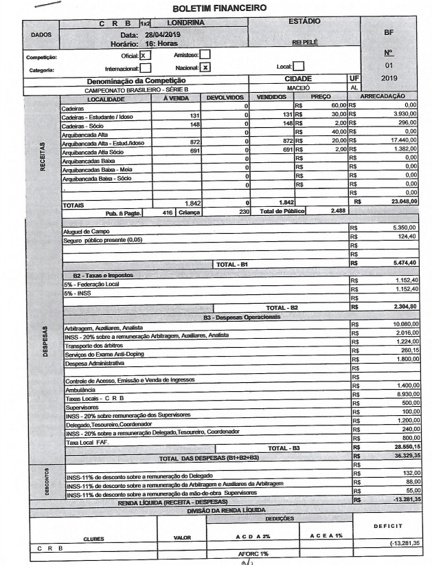 A Federação Alagoana de Futebol divulgou nesta segunda-feira (29) o boletim financeiro do jogo entre CRB e Londrina, válido pela estreia da Série B do Campeonato Brasileiro. Segundo o documento, 1.842 torcedores pagaram ingressos para o duelo que terminou com a vitória do Londrina por 2 a 1. O público presente no Rei Pelé foi de 2.488 torcedores.