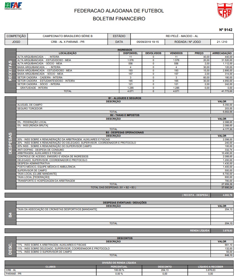 Ainda de acordo com o documento, o Regatas somou R$ 41.773,00 em renda bruta com a venda de ingressos e, depois de ter as despesas descontadas com o mando de campo, ficou com R$ 3.878,63 de renda líquida. Veja abaixo.