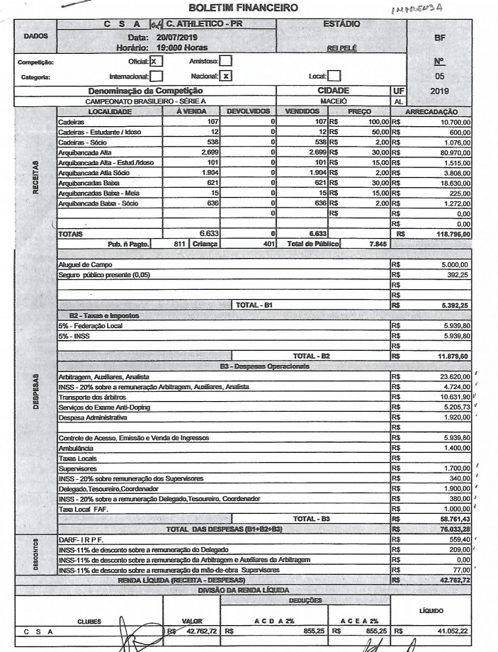 A goleada por 4 a 0 para o Athletico Paranaense, no último sábado (20), marcou o retorno do CSA ao Rei Pelé após a parada do Campeonato Brasileiro para a disputa da Copa América no Brasil. Segundo o boletim financeiro publicado pela CBF, 6.633 torcedores pagaram para assistir ao jogo, que teve público total de 7.845.