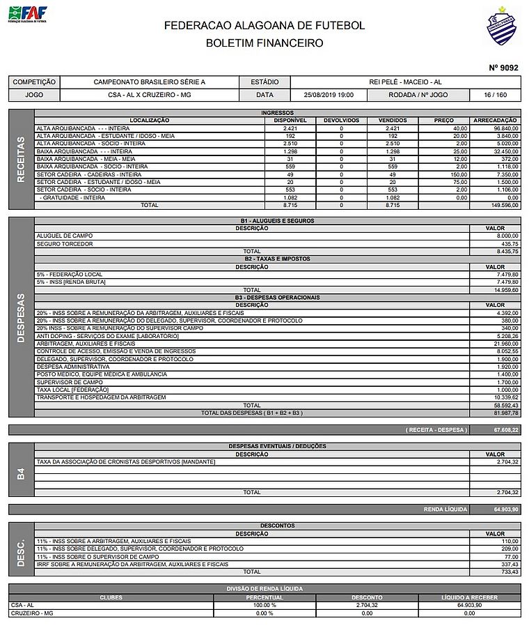 O empate em 1 a 1 entre CSA e Cruzeiro no último domingo (25), no Rei Pelé, em Maceió, foi visto por 8.715 torcedores presentes no Trapichão, destes, 7.633 pagaram ingresso. Os números são do boletim financeiro da partida, publicado no site da CBF.