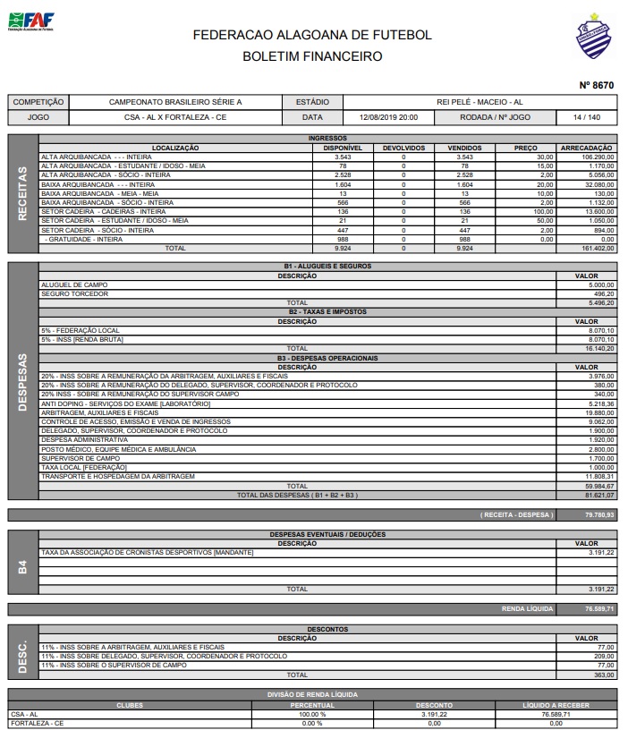 De acordo com o borderô, o clube marujo arrecadou R$ 161.402,00 em renda bruta com a bilheteria. Após descontar os gatos com o mando de campo, o Azulão lucrou R$ 76.589,71 em renda líquida. Esse foi o oitavo jogo em que o CSA foi mandante nesta Série A, sendo o sétimo no Rei Pelé, já que o mando com o Flamengo foi vendido para Brasília.