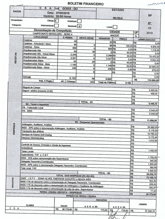O boletim financeiro do jogo, disponibilizado pela Federação Alagoana de Futebol nesta terça-feira (28), aponta arrecadação de R$ 110.960,00 com a venda de ingressos e um lucro de R$ 37.228,70 em renda líquida.