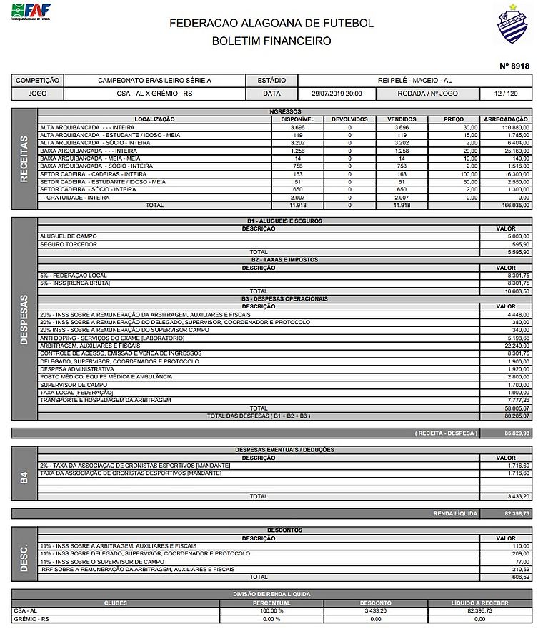 Apesar de não conquistar a vitória, o CSA voltou a pontuar na Série A do Brasileirão ao empatar em 0 a 0 com o Grêmio na última segunda-feira (29), no Rei Pelé. O boletim financeiro, publicado no site da CBF, apontou público pagante de 9.911 torcedores e um total de 11.918 presentes.