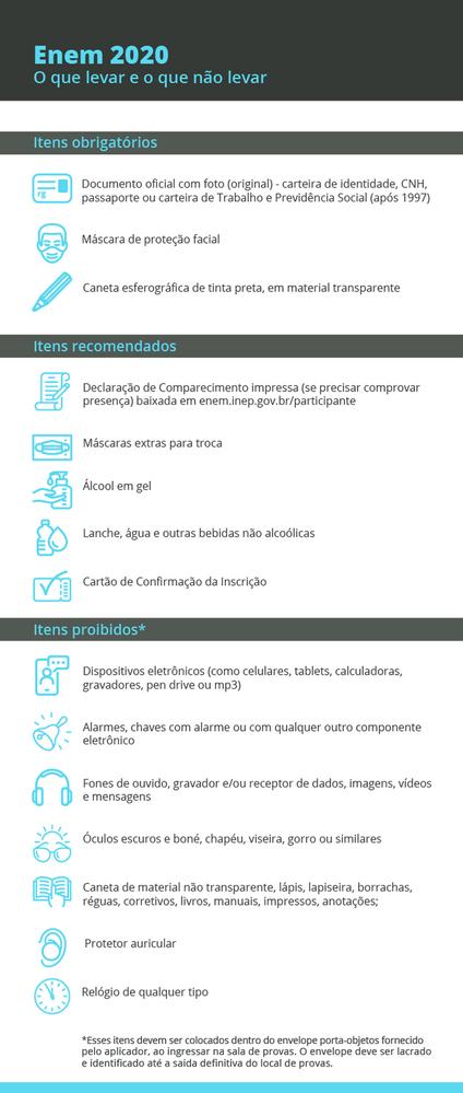 Neste ano, além do documento oficial de identificação com foto e da caneta esferográfica de tinta preta, fabricada em material transparente, itens obrigatórios também nos exames anteriores, a máscara de proteção facial passa a integrar essa lista. Os participantes que não estiverem com máscara de proteção facial não poderão ingressar no local de prova.