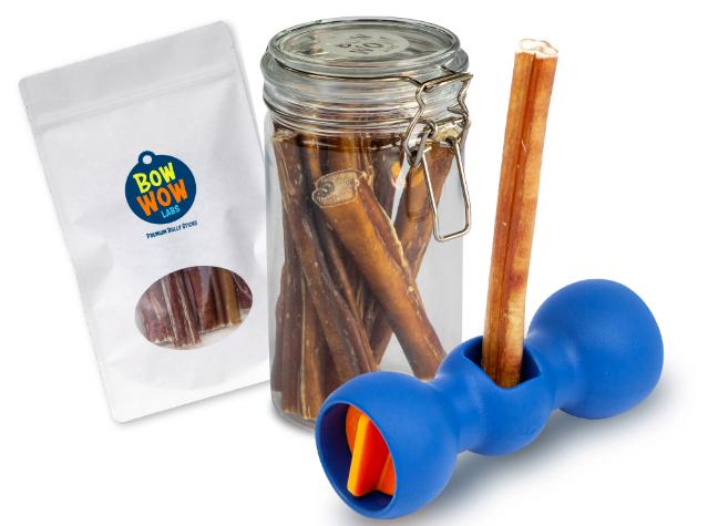 Bully Buddies estão disponíveis em cinco tamanhos. ” O kit inicial visto aqui inclui tudo na foto, incluindo o brinquedo, seis paus e um pote hermético para mantê-los frescos e saborosos para o seu pequeno discernidor.