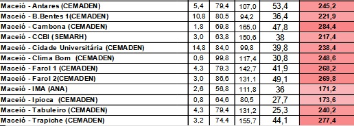 As outras regiões listadas pelo órgão estadual aparecem com número inferior a 250 mm, tendo o Clima Bom como o mais próximo da média, com 248 mm, seguido por Antares, Tabuleiro do Martins, Cidade Universitária e Benedito Bentes. Veja abaixo na sequência do dia 23 ao dia 26 de maio, com o total acumulado destacado na cor vermelha: