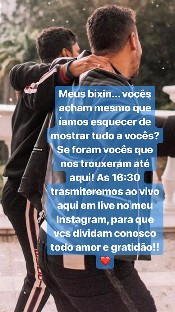 "Meus bixin... vocês acham mesmo que íamos esquecer de mostrar tudo a vocês? Se foram vocês que nos trouxeram até aqui! As 16h30 transmitiremos ao vivo aqui em live no meu Instagram, para que vocês dividam conosco todo amor e gratidão!", escreveu no post.