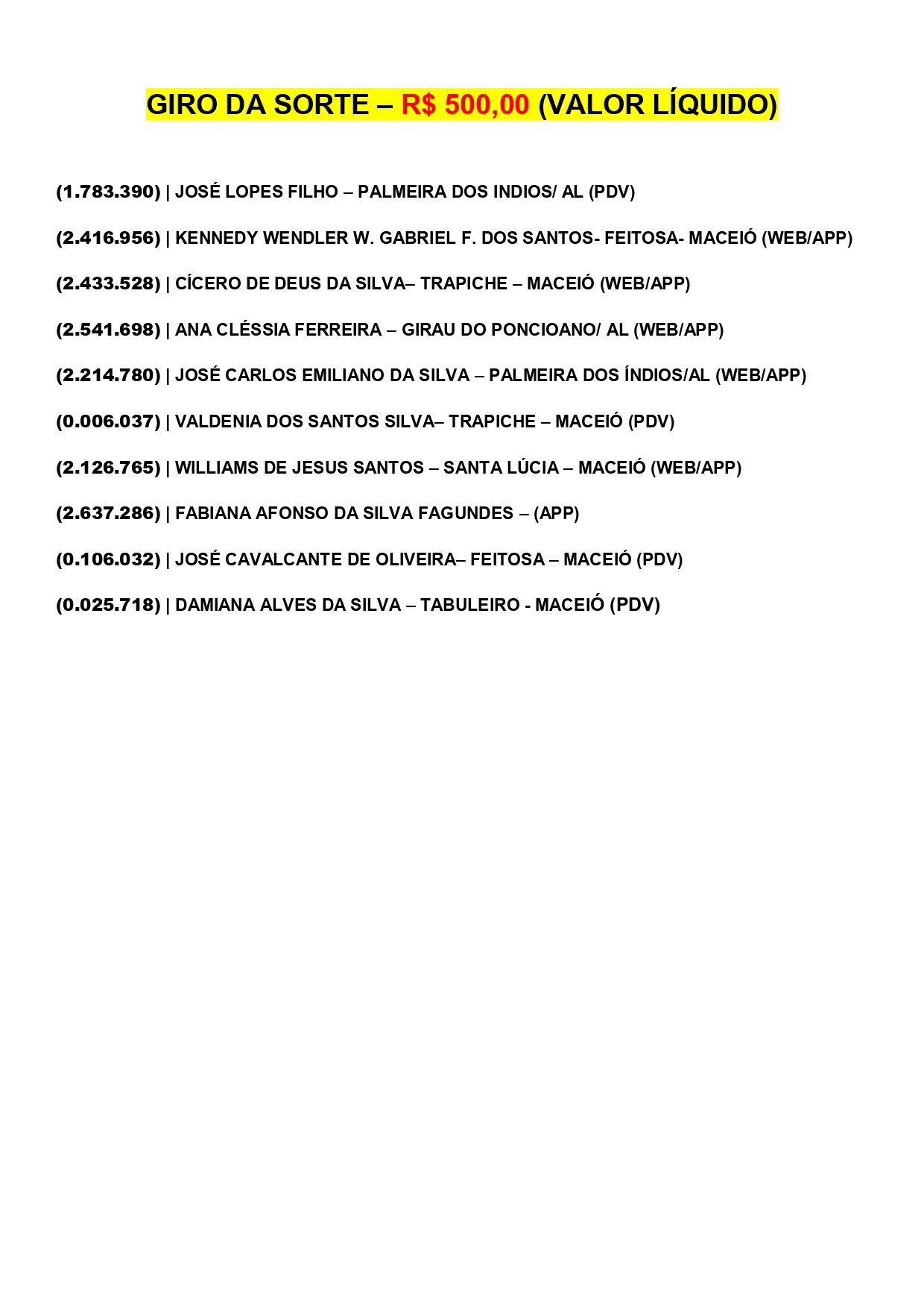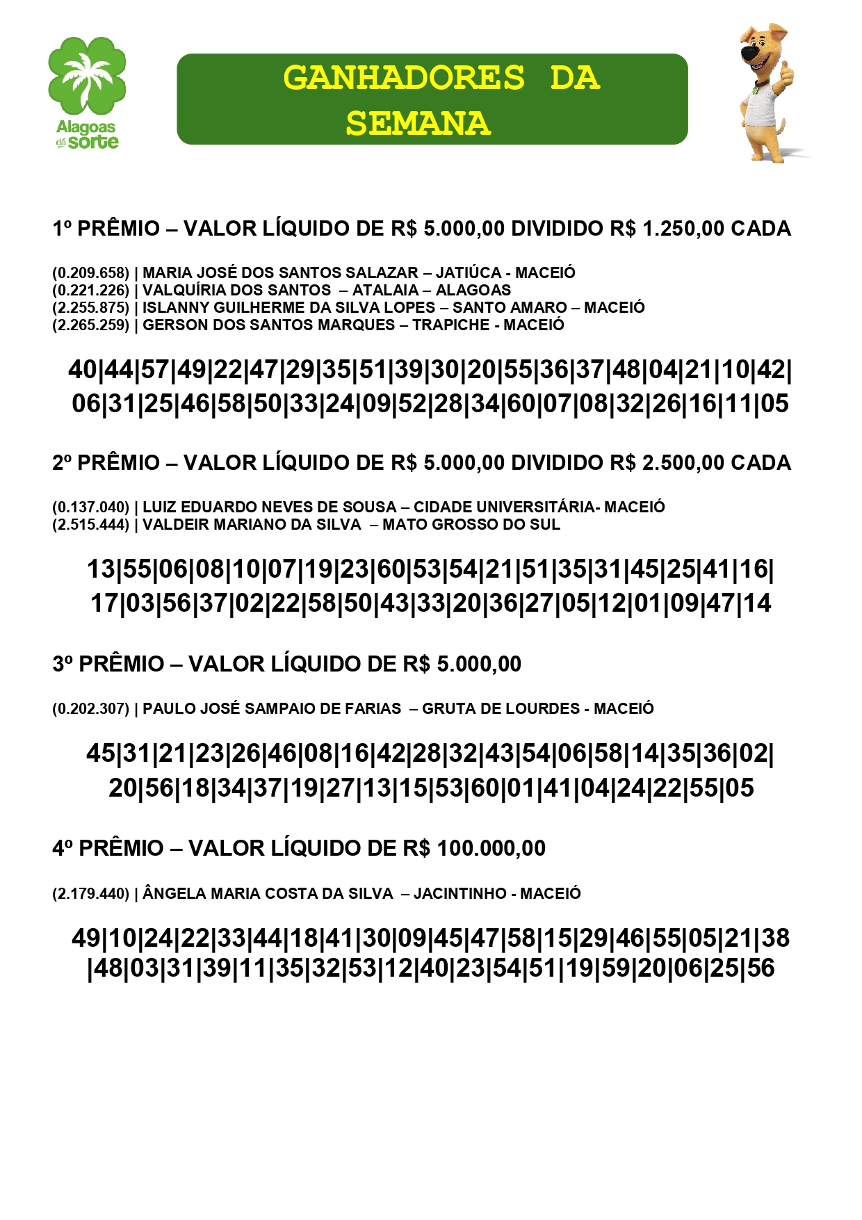 Veja abaixoos ganhadores da edição do Alagoas dá Sorte deste domingo, 5: