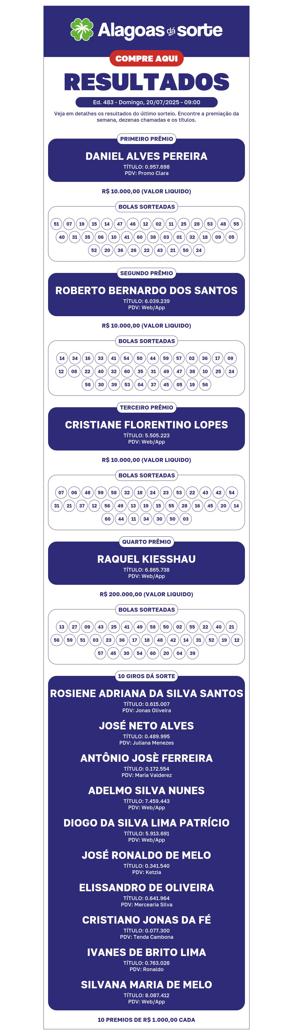 Veja os ganhadores do Alagoas Dá Sorte deste domingo, 20 de julho