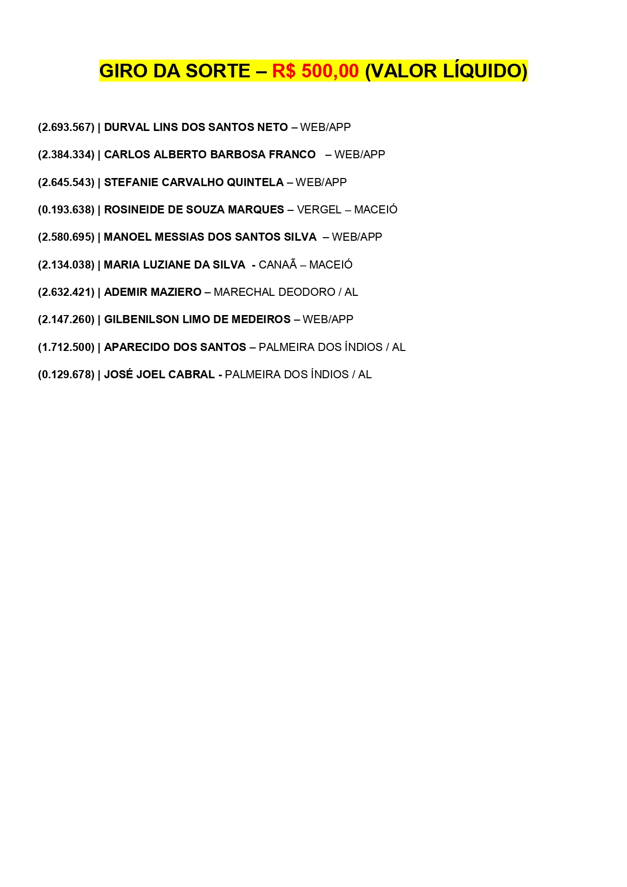 Veja os ganhadores do sorteio do Alagoas dá Sorte deste domingo, 23 de novembro