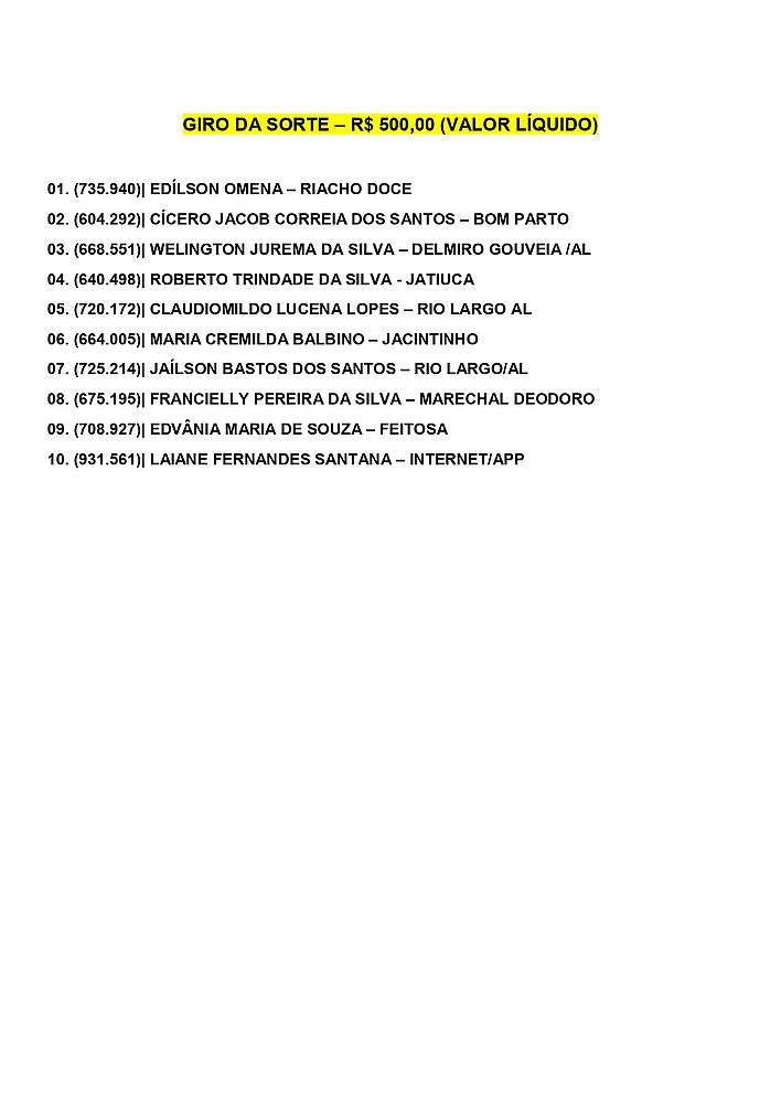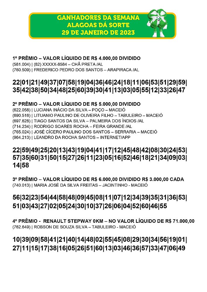 Veja os ganhadores do Alagoas dá Sorte deste domingo, 5 de fevereiro