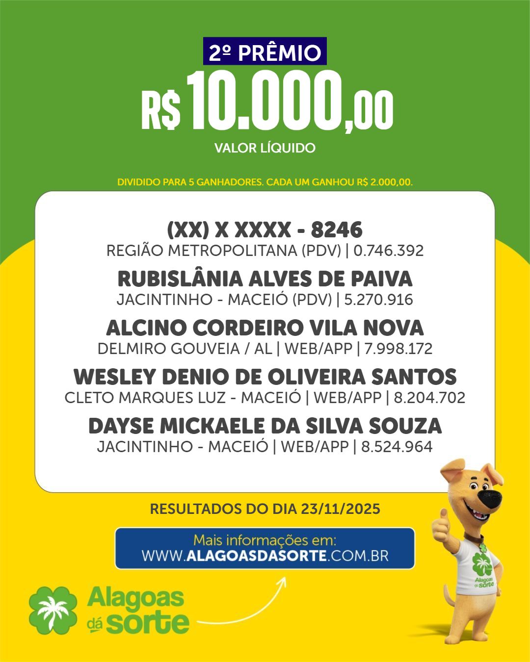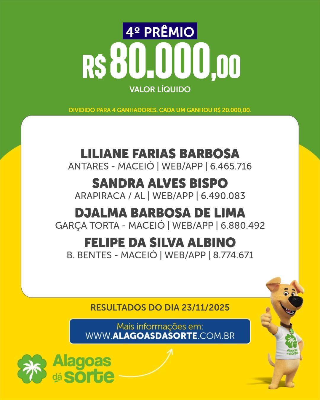 Confira os ganhadores do sorteio do Alagoas dá Sorte deste domingo, 23 de novembro.