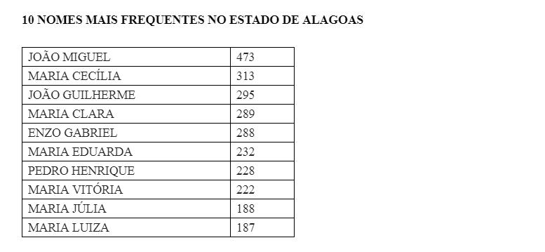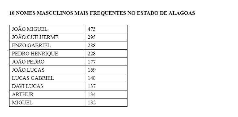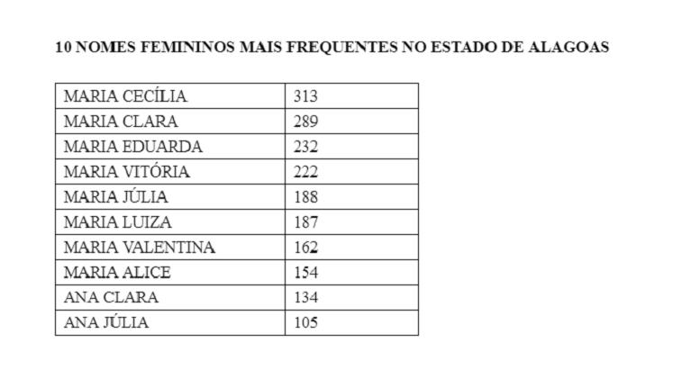 João Miguel, com 473 registros, e Maria Cecília, com 313, foram os nomes mais escolhidos pelos pais no momento do registro de nascimento de seus filhos no Estado de Alagoas em 2018. É o que apontam os dados compilados pelos cartórios de Registro Civil do Estado. Veja abaixo o ranking completo.
