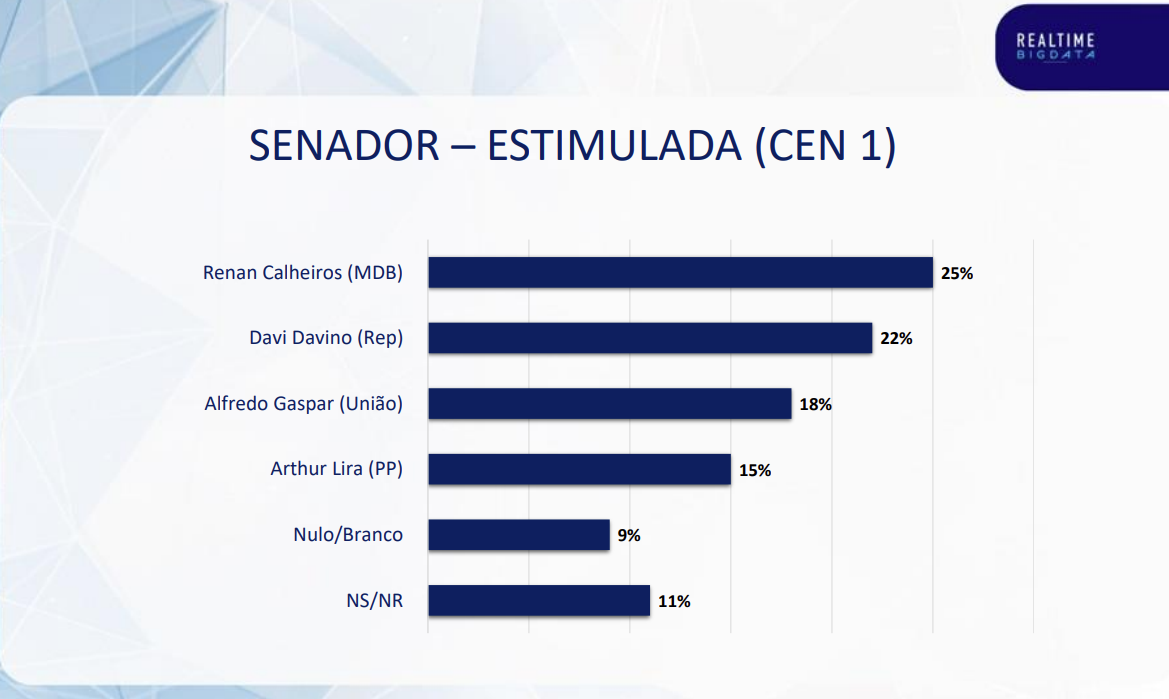 No primeiro cenário, o senador Renan Calheiros (MDB) aparece na liderança com 25% das intenções de voto. Em seguida, o ex-deputado Davi Davino (Republicanos) surge com 22%, ficando tecnicamente empatado dentro da margem de erro.