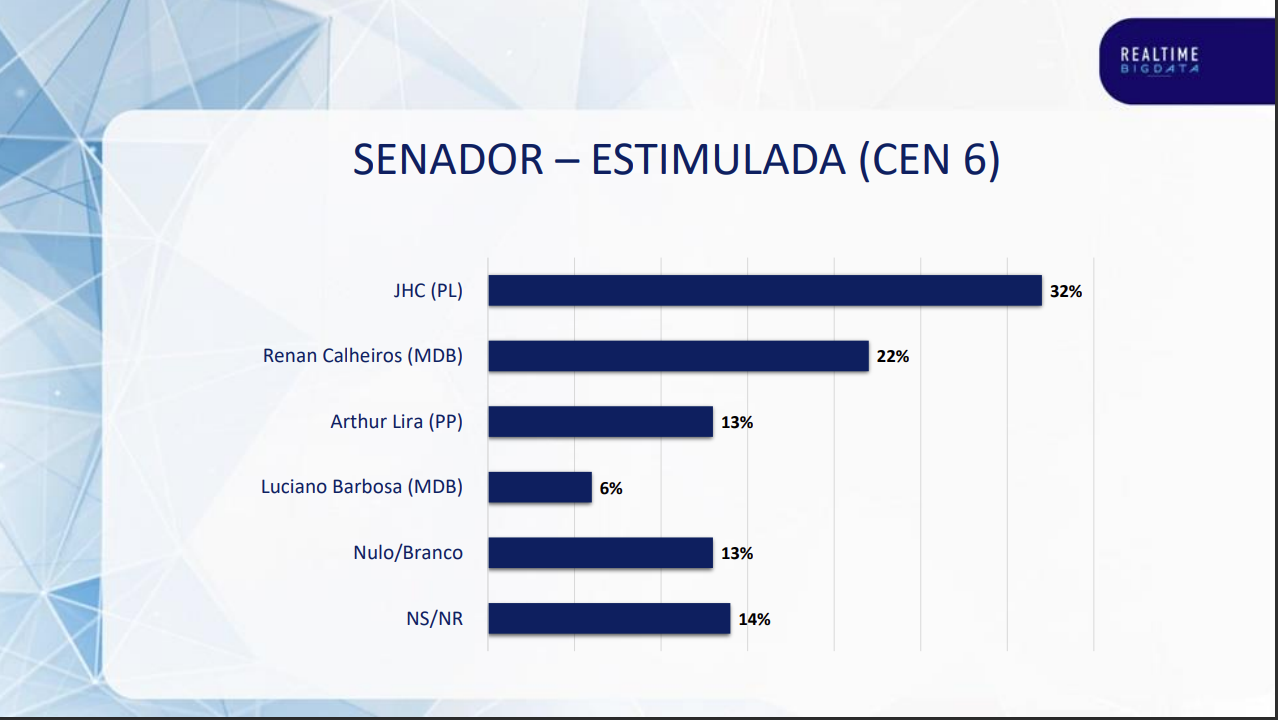 No Cenário 6, a pesquisa divulgada nesta quarta-feira, 24, o prefeito de Maceió, JHC (PL), aparece na frente com 32% das intenções de voto.
