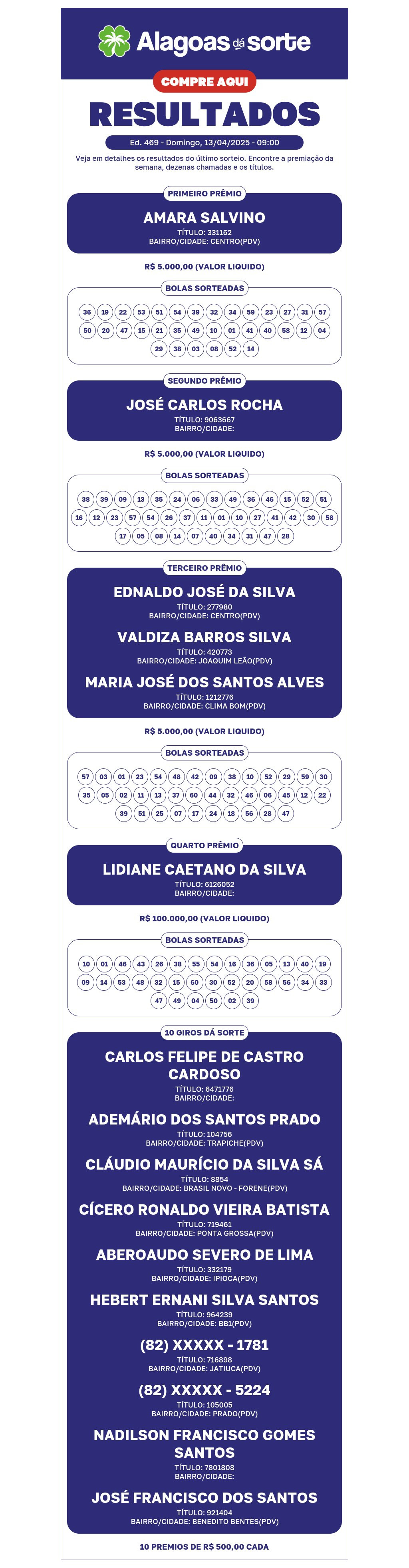Veja os resultados do Alagoas dá Sorte deste domingo, 13 de abril de 2025.