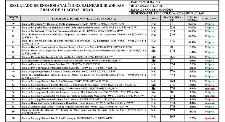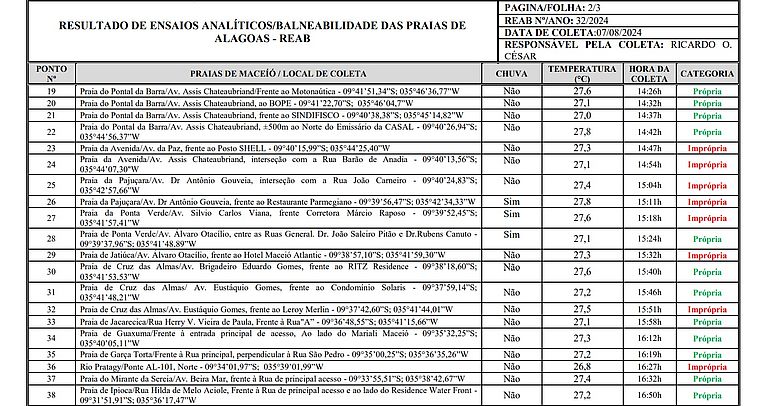 O relatório de balneabilidade das praias, divulgados pelo Instituto de Meio Ambiente de Alagoas (IMA), nesta sexta-feira, 9, aponta que 18 trechos de toda costa alagoana estão impróprios para banho. A coleta das águas foi realizada por peritos do IMA entre a terça, 6, e a quarta-feira, 7.